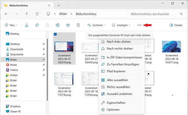 Bei Windows 11 klicken Sie wiederum auf die drei Punkte neben Anzeigen und wählen aus dem erscheinenden Menü die gewünschte Option aus, Bild 2.
