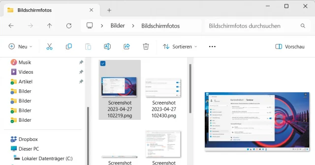 Normalerweise zeigt der Windows-Explorer nur die wichtigsten Informationen über einzelne Dateien. Zusätzlich können Sie rechts eine weitere Leiste einblenden, in der das Programm eine kleine Vorschau der gerade ausgewählten Datei unterbringt. Windows-10-Nutzer aktivieren diese Vorschau auf dem Reiter Ansicht durch einen Klick links auf Vorschaufenster. Nutzer mit Windows-11-PCs gehen dagegen zu Anzeigen und danach zu Vorschaufenster, Bild 4.