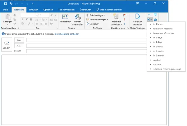 Boomerang ist in einer Basisversion gratis. Es funktioniert mit Outlook Online, Outlook 2013+ für Windows, Outlook 2016+ für Mac und benötigt eine Office-365-Mailbox.