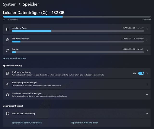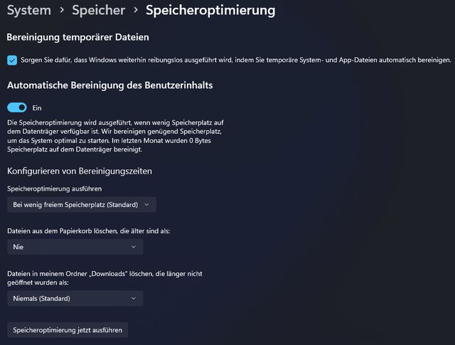 Wenn also nicht CCleaner, was dann? Schliesslich soll der PC ja sauber und aufgeräumt sein. Die einfachste Option ist es, Windows die Arbeit machen zu lassen. Unter Windows 11 gibt es die sogenannte Speicheroptimierung (zu finden via Menüpunkt Einstellungen/System/Speicher).