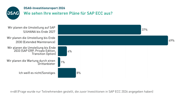 Bei der Umstellung auf SAP ERP Central Component (ECC) spielt die Dauer der Wartung eine entscheidende Rolle. Fast die Hälfte der Anwender nimmt Mehrkosten für die Extended Maintenance (bis 2030) in Kauf.