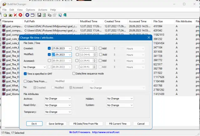 Im nun geöffneten Dialogfenster haken Sie «Erstellt» (Created) oder «Geändert» (Modified) an – oder beides. Passen Sie die beiden Werte auf die gewünschten Zeitstempel an und klicken Sie auf Ausführen (Do it). Schon zeigen die Dateien in den Eigenschaften die gewünschten Zeitstempel.