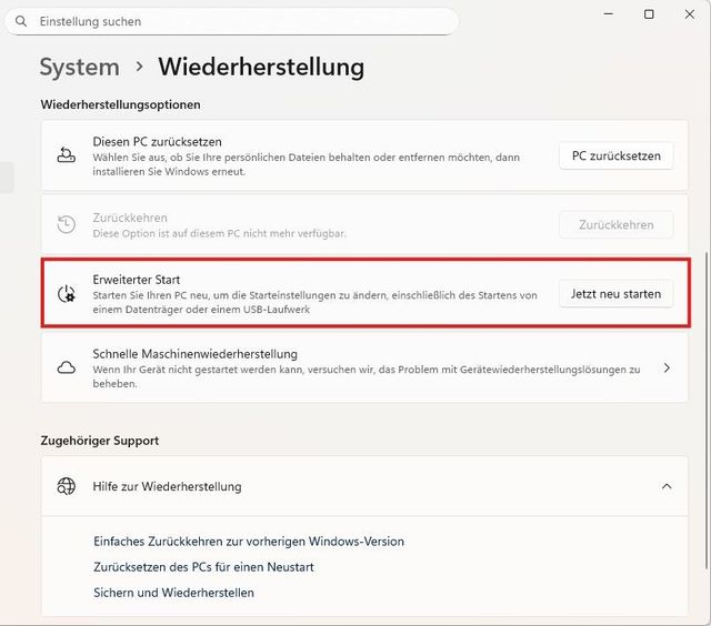 Für Systemfehler etwa in der Registry gibt es Tools wie CCleaner (siehe auch Artikel in diesem Heft auf S. 20), die eine Reparatur versprechen. Microsoft rät jedoch davon ab und empfiehlt stattdessen, systemeigene Tools einzusetzen. Öffnen Sie im Startmenü die Einstellungen von Windows und navigieren Sie zum Punkt System und dort zu Wiederherstellung. Klicken Sie unter Erweiterter Start auf Jetzt neu starten, Bild 8. Im Startfenster greifen Sie zu Problemhandlung – Erweiterte Optionen und wählen den Punkt Starthilfe. Geben Sie Ihr Benutzerkonto an, um die automatische Reparatur von Windows-Fehlern zu starten. Dabei prüft Windows auch die Integrität der Registry und versucht, Fehler zu beheben. In vielen Fällen genügt dies bereits, um eine defekte Registry zu repariere.