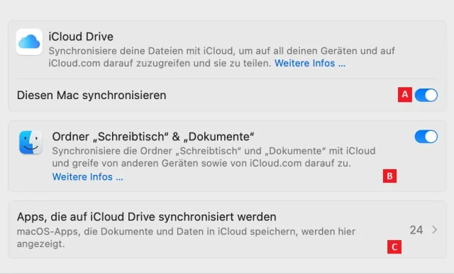 Der wichtigste Zweck von iCloud besteht darin, Daten zwischen den Apple-Geräten abzugleichen und zu sichern. Doch was nach einem klar definierten Auftrag klingt, offenbart mehrere Facetten. Öffnen Sie erneut die Systemeinstellung Apple-ID und anschliessend den Bereich iCloud. Klicken Sie unter Apps, die iCloud verwenden auf den Punkt iCloud Drive.- iCloud Drive. Die Option iCloud Drive aktiviert den iCloud-Speicher wie ein Laufwerk auf dem Schreibtisch, Bild 2 A. Alles, was hier hineingelegt wird, synchronisiert sich. Dieses Laufwerk lässt sich am ehesten mit anderen Cloud-Anbietern wie Dropbox oder Microsoft OneDrive vergleichen.