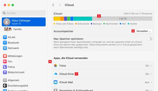 Um sich einen Überblick über die aktuellen iCloud-Funktionen zu verschaffen, öffnen Sie am Mac die Systemeinstellung Apple-ID und klicken in der linken Spalte auf den Bereich iCloud. Es hagelt Informationen.