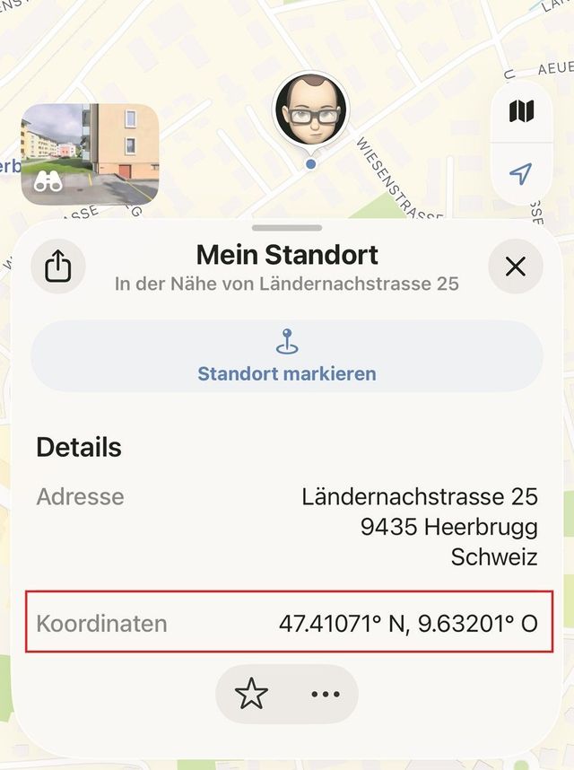 Die Übung ist einfach, wenn die Karten-App auf dem iPhone hinzugezogen wird. Tippen Sie auf den blauen Punkt, der die eigene Position markiert. Nun werden nicht nur die aktuelle Adresse angezeigt (falls vorhanden), sondern auch die GPS-Koordinaten im Dezimalformat.