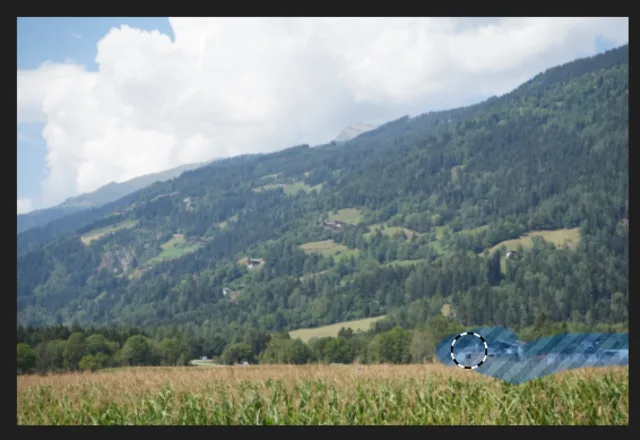Öffnen Sie das gewünschte Bild im Bearbeitungsmodus. Wählen Sie das Werkzeug Generatives Löschen, Bild 9. Nun können Sie mit dem Pinsel über das Objekt malen, das Sie nicht mehr im Bild haben möchten. In unserem Beispiel sind das die Häuser, Bild 10. Die KI versucht nun, die Objekte zu entfernen.