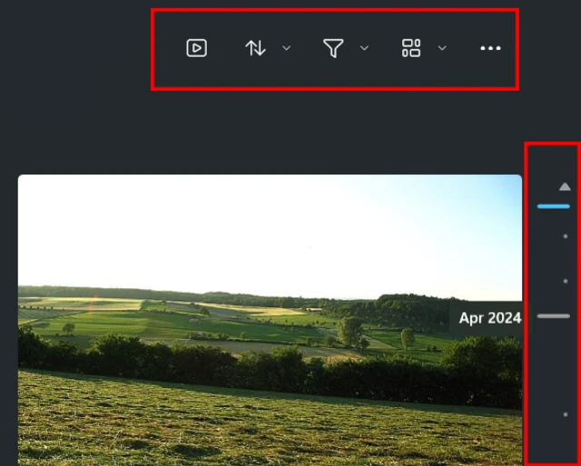 Der Abschnitt Alle Fotos enthält die Fotos aller hinzugefügten Ordner nach Datum geordnet (die neuesten Aufnahmen werden dabei zuerst angezeigt). Oben rechts können Sie nun nach Belieben Filter anwenden – etwa, um die Ansicht zu ändern oder nach anderen Kriterien zu ordnen. Fahren Sie mit dem Mauszeiger ganz rechts über die Seitenleiste, erscheint ausserdem eine Art senkrechter Zeitstrahl, in dem Sie nach Monaten navigieren können, Bild 5.