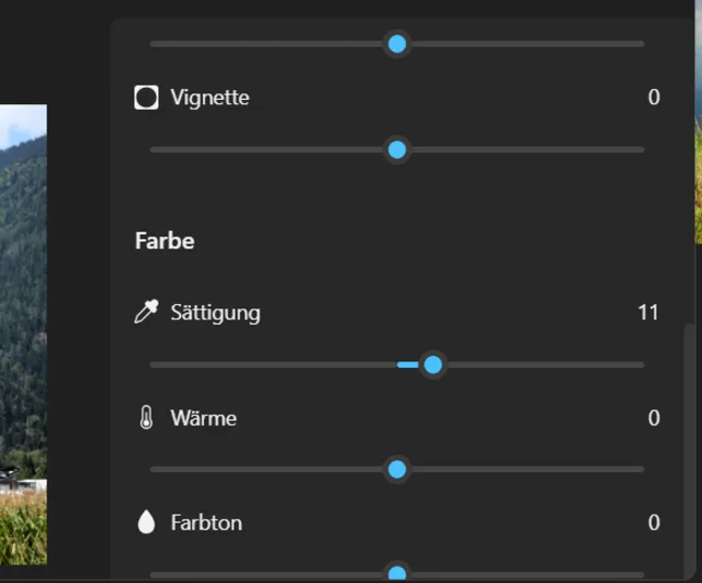 Klicken Sie auf die Option Anpassung (das Sonnen-Icon), nachdem Sie das Foto ausgewählt haben. Von hier aus können Sie unter anderem die Helligkeit, den Kontrast, die Lichter und die Schatten Ihres Fotos anpassen, indem Sie die entsprechenden Regler nach links oder rechts verschieben. Wenn Sie weiter nach unten scrollen, lässt sich ebenfalls die Farbe des Bildes beeinflussen, Bild 8.