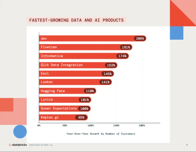 - Am schnellsten wachsende und beliebteste Daten- und KI-Produkte: Open-Source-Produkte dominieren den Daten- und KI-Markt. 8 von 10 der am weitesten verbreiteten Daten- und KI-Produkte von Databricks basieren auf Open Source. Microsoft Power BI ist das beliebteste Daten- und KI-Produkt des Jahres 2023, gefolgt von Databricks Lakehouse, das auf Platz 7 rangiert. Das Open-Source-Produkt Hugging Face demokratisiert KI mit seiner NLP-Bibliothek, die trainierte Modelle für eine Vielzahl von Aufgaben bereitstellt. Das am schnellsten wachsende Daten- und KI-Produkt ist dbt, das gemessen an der Zahl der Kunden um 206 Prozent zulegte.