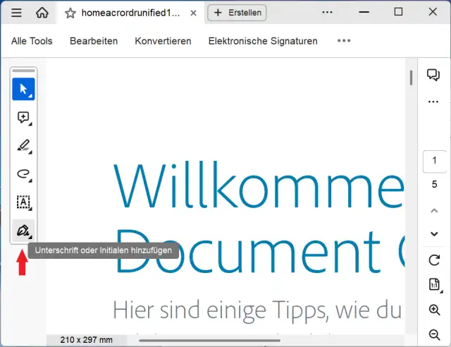 Klicken Sie im Tab mit dem geöffneten PDF auf das Symbol zum Unterschreiben Ihres Dokuments. Es sieht aus wie eine Füllfeder.