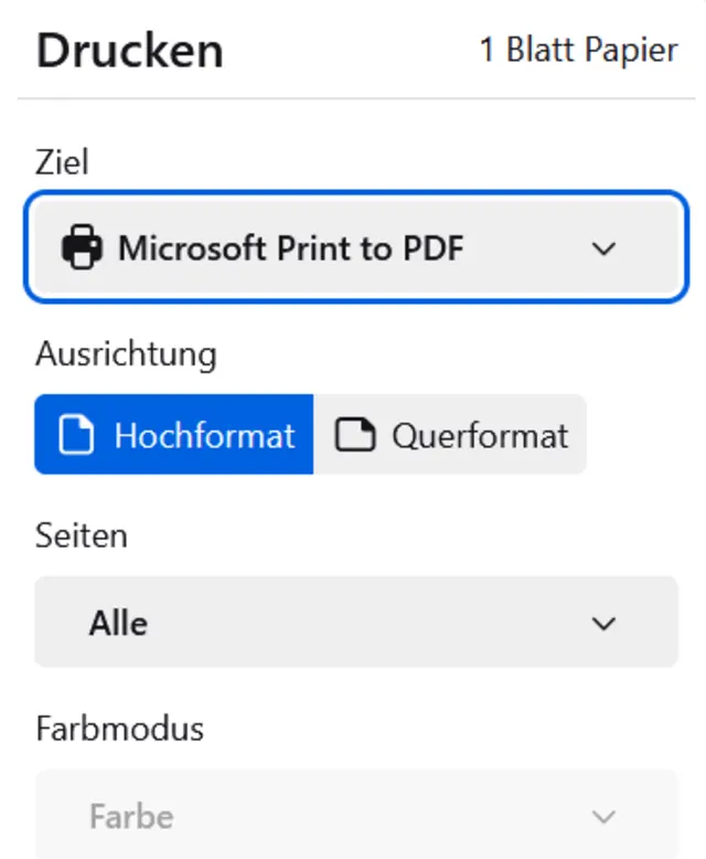 Öffnen Sie dazu Ihr Dokument und drücken Sie die Tasten Ctrl+P, um den Druckdialog aufzurufen. Beim Eintrag Ziel wählen Sie Microsoft Print to PDF aus, Bild 7.