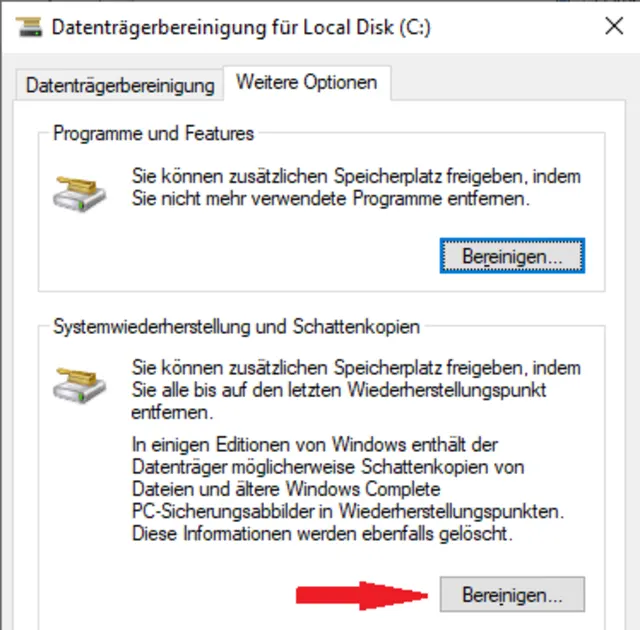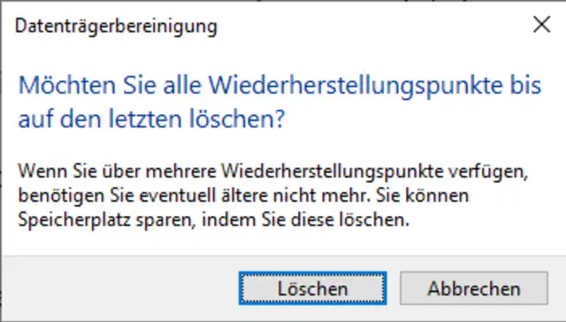 Es gibt noch eine weitere Variante, und zwar direkt in der Datenträgerbereinigung. Dieser Fall löscht alle Wiederherstellungspunkte mit Ausnahme des neusten, Bild 10. Dazu rufen Sie in Windows 10 via Startmenü die Datenträgerbereinigung auf und klicken auf Systemdaten bereinigen. In Windows 11 finden Sie die Datenträgerbereinigung, indem Sie im Startmenü auf Alle Apps klicken und die Windows-Tools öffnen. In diesen steckt die Datenträgerbereinigung.