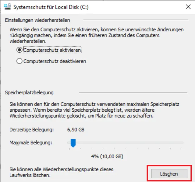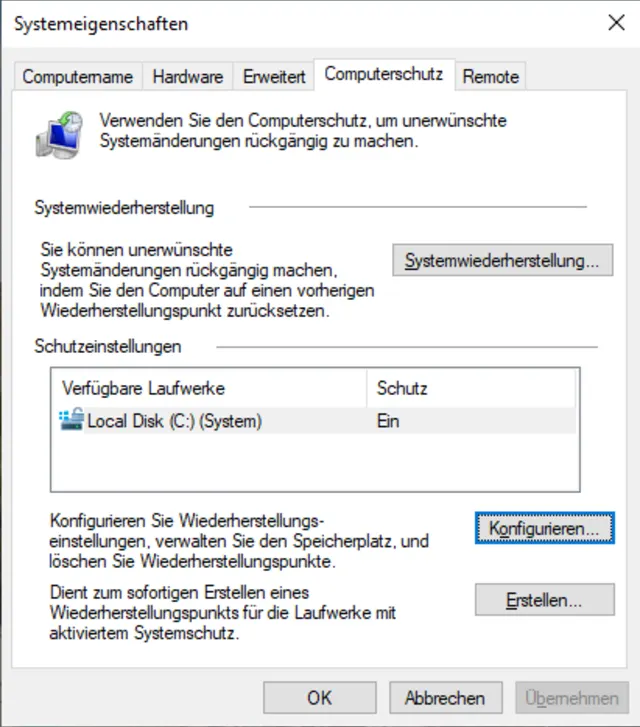 Wechseln Sie zum Menüpunkt Systemwiederherstellung konfigurieren. Unter Schutzeinstellungen sehen Sie, für welche Festplatte der Computerschutz aktiviert ist und wie viel Speicherplatz dafür zur Verfügung steht.