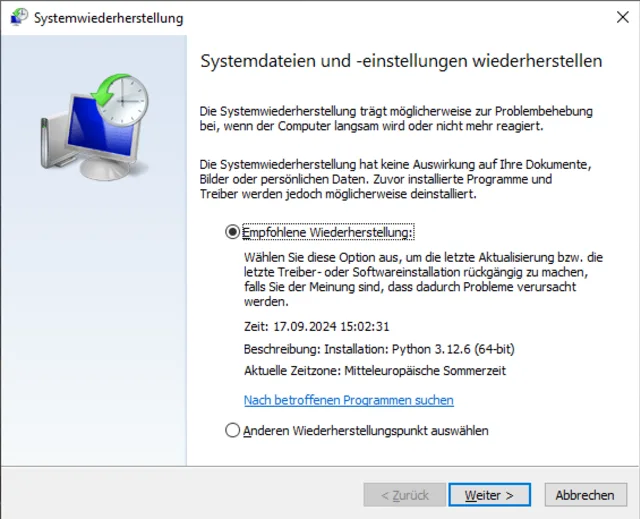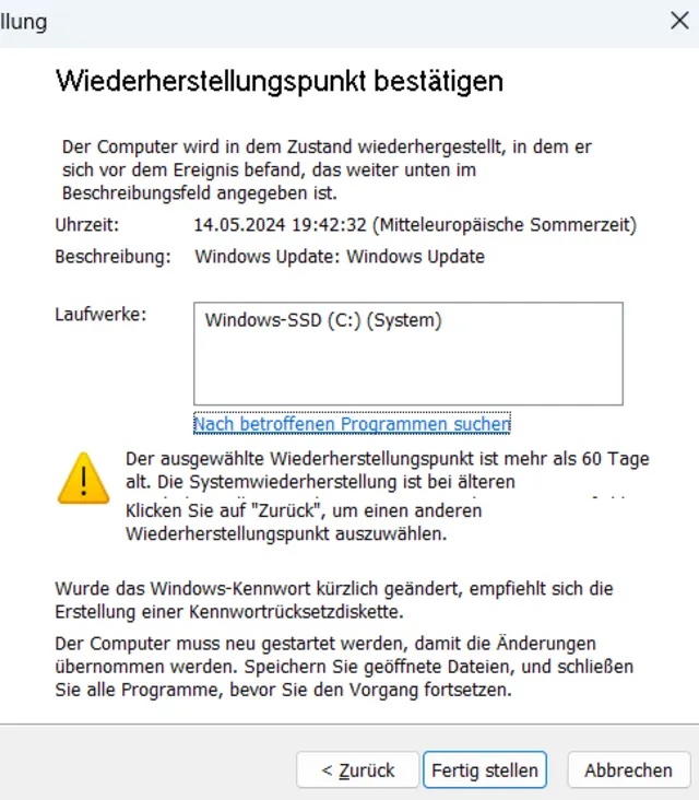Kleine Abkürzung: Wenn Sie im Ausführen-Dialog rstrui eingeben, gelangen Sie direkt dorthin. Ist der Button ausgegraut, dann ist die automatische Erstellung von Wiederherstellungspunkten deaktiviert.