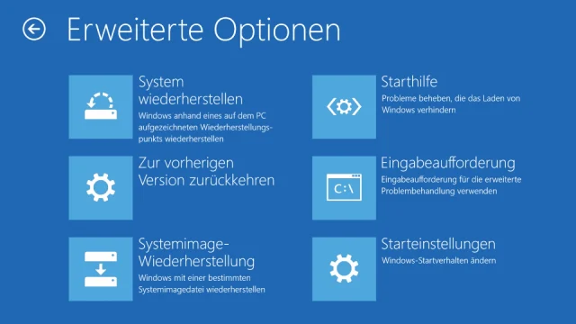 Windows erstellt in beiden Fällen einen neuen Ordner mit dem Namen WindowsImageBackup, der das Image enthält. Ein solches System-Image lässt sich über die erweiterten Startoptionen wieder zurückspielen. Dort finden Sie in der Problembehandlung die Erweiterte Optionen mit dem Menüpunkt zur Systemimage-Wiederherstellung (siehe Bild 7).
