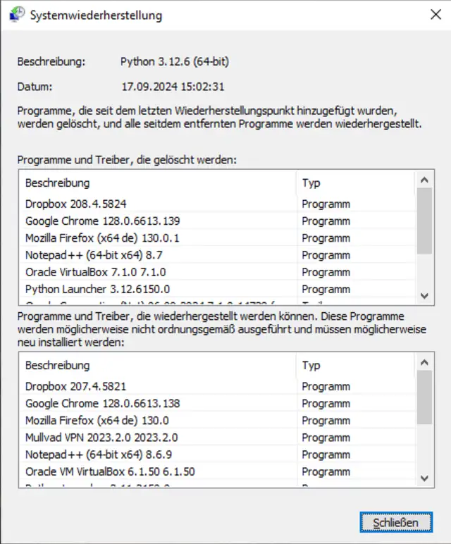Mit den folgenden Schritten erfahren Sie, welche Dateien bei einer Systemwiederherstellung verloren gehen. Drücken Sie die Tastenkombination Windowstaste+R, um zum Ausführen-Dialog zu gelangen. Mit dem Befehl rstrui.exe öffnen Sie die Systemwiederherstellung. Klicken Sie auf Anderen Wiederherstellungspunkt auswählen. Nach einem Klick auf Weiter wählen Sie den gewünschten Wiederherstellungspunkt. Ein Klick auf Nach betroffenen Programmen suchen führt zu einem Fenster, das darüber informiert, welche Programme verloren gehen, Bild 8.