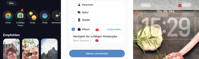 Im nächsten Schritt wählen Sie aus verschiedenen Motiven. Doch um das vorhin angelegte Album auszuwählen, tippen Sie am oberen Rand auf Zufällige Fotos A. Wählen Sie anschliessend das frischgebackene Album aus B und bei welcher Gelegenheit die Motive wechseln sollen C. Mit einem Tippen auf Album verwenden wird die Auswahl bestätigt.