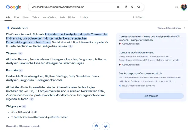 Übersicht mit KI ist für angemeldete Nutzer:innen ab 18 Jahren in der Schweiz ab sofort auf Deutsch, Französisch und Italienisch sowie auf Englisch verfügbar.