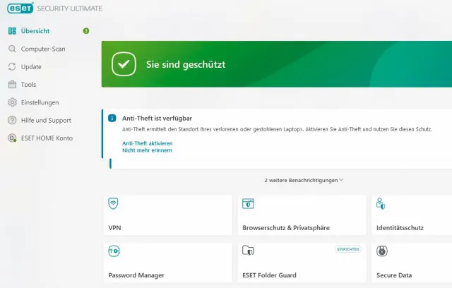 Das Startmenü der Eset-Suite ist einfach aufgebaut, die Bedienung intuitiv. Links befinden sich in tabellarischer Form die Menüpunkte Übersicht, Computer-Scan, Update, Tools, Einstellungen sowie Hilfe und Support und das ESET Home Konto, das anzeigt mit welchem Gerät das Konto verbunden ist. Ausserdem werden auf dieser Startseite Auffälligkeiten, Bedrohungen oder versuchte Angriffe eingeblendet. Der Hersteller arbeitet mit den Ampelfarben Rot, Gelb und Grün, um auf eine Gefährdung hinzuweisen. Die Untermenüs sind sauber programmiert, auf verschachtelte Optionen oder technisches Kauderwelsch wird verzichtet.