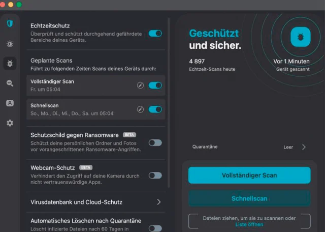 In der Mitte lassen sich Anwendungen wie Echtzeitschutz, Webschutz oder der Schnellscan direkt starten.