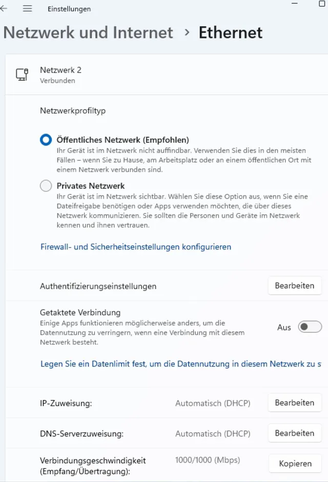 Bei Windows 11 geht das fast genauso. Geben Sie bei Start den Begriff Einstellungen ein, klicken Sie im Statusfenster auf Ethernet und Eigenschaften Privates Netzwerk. Hier wechseln sie zu Öffentliches Netzwerk, Bild 3. Der Wechsel zurück ist genauso einfach.