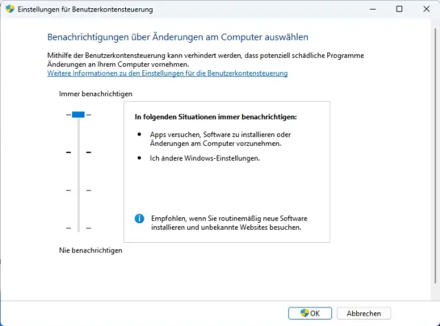 Die voreingestellte dritte Stufe ist ein Kompromiss zwischen Sicherheit und Bequemlichkeit. So wird man als Nutzer immer informiert, wenn Apps Veränderungen am System vornehmen. Allerdings: Wenn ein Angreifer eine Windows-Anwendung übernimmt und etwas verändert, geschieht das im Namen des Administrators – also in Ihrem Namen – und es gibt keine Benachrichtigung im System, der Sie zustimmen müssen.