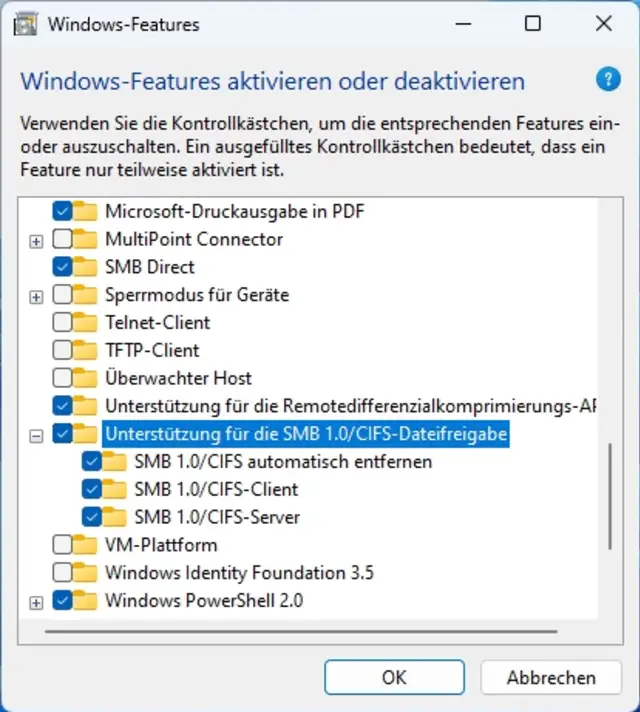 Eine weitere Altlast sind betagte SMB-Netzwerkprotokolle. Sie sorgen dafür, dass man auf ältere Geräte als Netzlaufwerke zugreifen kann. Die alten Versionen sind SMB 1.0 und 1.1. Die Versionen 2.0 und 3.0 sind aktuell. Die alten Protokolle sind anfällig für verschiedene Arten von Angriffen. Geben Sie unter Windows 10 oder 11 im Start-Menü den Begriff Windows Features ein und klicken Sie auf Windows-Features aktivieren oder deaktivieren. Suchen Sie dort den Eintrag Unterstützung für die SMB 1.0/CIFS-Dateifreigabe und entfernen Sie alle Häkchen – auch bei den Untereinträgen. Meistens möchte Windows danach einen Neustart, Bild 7.