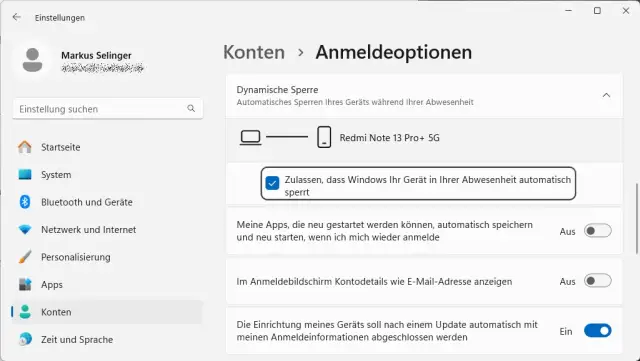 Recht neu ist die dynamische Sperre. Damit lässt sich ein via Bluetooth-Funk gekoppeltes Handy als Schlüssel verwenden. Sobald sich der Anwender zu weit vom PC entfernt, verschliesst sich die PC-Oberfläche. Dazu müssen Sie zuerst via Windowstaste+I und Geräte das Bluetooth-Handy registrieren. Danach drücken Sie Windowstaste+I und gehen via Suchfunktion zu Dynamische Sperre. Im Dialog aktivieren Sie Zulassen, dass Windows Ihr Gerät in Ihrer Abwesenheit automatisch sperrt, Bild 10.