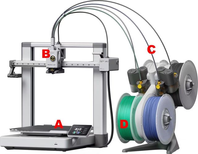 Der Aufbau eines 3D-Druckers ist leicht zu durchschauen. Am unteren Ende befindet sich die Heizplatte; ihre poröse Oberfläche hält das Modell an Ort und Stelle, Bild 2 A. Die Platte bewegt sich horizontal, während sich der Druckkopf B, Schicht für Schicht in die Höhe arbeitet. Beim gezeigten Modell handelt es sich um einen A1 Combo von Bambu Lab, der oft schon für weniger als 400 Franken angeboten wird.