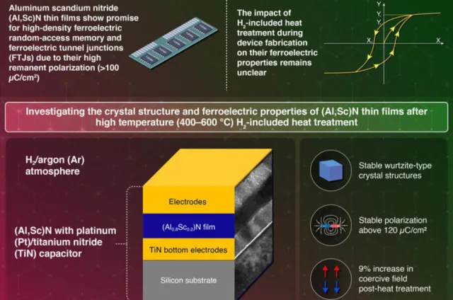 Manche bekannten ferroelektrischen Materialien wie Pb(Zr,Ti)O3 (PZT) und SrBi2Ta2O9 bauen jedoch ab und verlieren ihre Polarisation, wenn sie während der Herstellung im Zuge der Wärmebehandlung mit Wasserstoff in Kontakt kommen. Die Japaner haben jetzt aber nachgewiesen, dass ferroelektrische Filme aus Aluminum-Scandium Nitrid (AlScN) stabil bleiben und ihre ferroelektrischen Eigenschaften bis zu einer Temperatur von 600 Grad Celsius behalten.