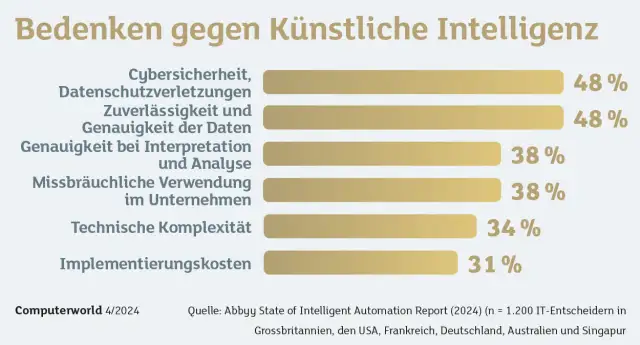 Bedenken haben aber auch die Unternehmen selbst, nicht zuletzt wegen ethischer und rechtlicher Aspekte. Gegenüber der IT-Beratung Deloitte gaben 41 % der Unternehmen an, dass sie Schwierigkeiten haben, die genauen Auswirkungen ihrer KI-Bemühungen zu messen, und 55 % meiden bestimmte Anwendungsfälle aufgrund datenbezogener Risiken.