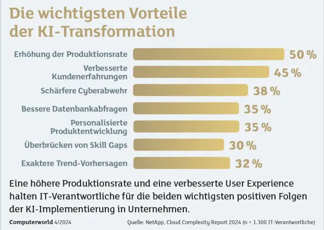 Fortschritte bei Effizienz und Innovationskraft sind auch bereits in der Praxis nachzuweisen, wie aus dem Cloud Complexity Report 2024 von NetApp hervorgeht, für den weltweit 1’300 IT-Verantwortliche zu den Vorteilen der KI-Transformation befragt wurden. Dabei gaben 50 Prozent der Unternehmen an, dass KI-Lösungen ihre Produktionsrate gesteigert haben, insbesondere durch Automatisierung von Routineprozessen, dem frühzeitigen Aufspüren von Engpässen und Wartungsbedarf. 45 % der Befragten gaben an, dass KI-Lösungen die Kundenerfahrung deutlich verbessern, insbesondere durch personalisierte Empfehlungen und massgeschneiderte Dienstleistungen. 35 % sehen Vorteile in der Produktentwicklung durch KI-gestützte Analyse-Tools. Bei 35 % der Befragten hat sich Qualität von Datenbankabfragen mittels KI deutlich erhöht.