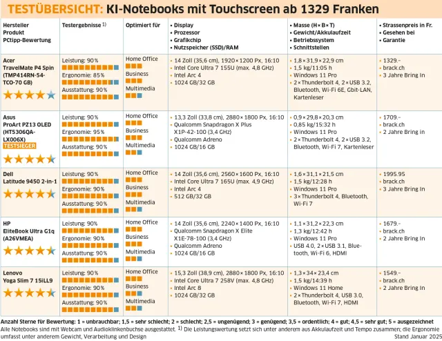 In diesem Test haben wir uns auf Notebooks mit Touchscreen, langer Akkulaufzeit und KI-Tauglichkeit konzentriert. Erfreulich: Alle fünf Modelle verdienen sich Top-Noten bezüglich Ausstattung, Mobilität, Ergonomie und Anwendungsmöglichkeiten.