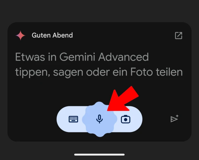 Um in Gemini eine Frage einzugeben, tippen Sie auf das Tastatur-Symbol und geben Ihre Anfrage ein. Wenn Sie fertig sind, tippen Sie auf die Pfeiltaste, um Ihre Frage zu senden und die Antwort abzuwarten. Möchten Sie die App per Sprachanweisung nutzen, tippen Sie einfach auf das Mikrofon-Symbol, Bild 11.