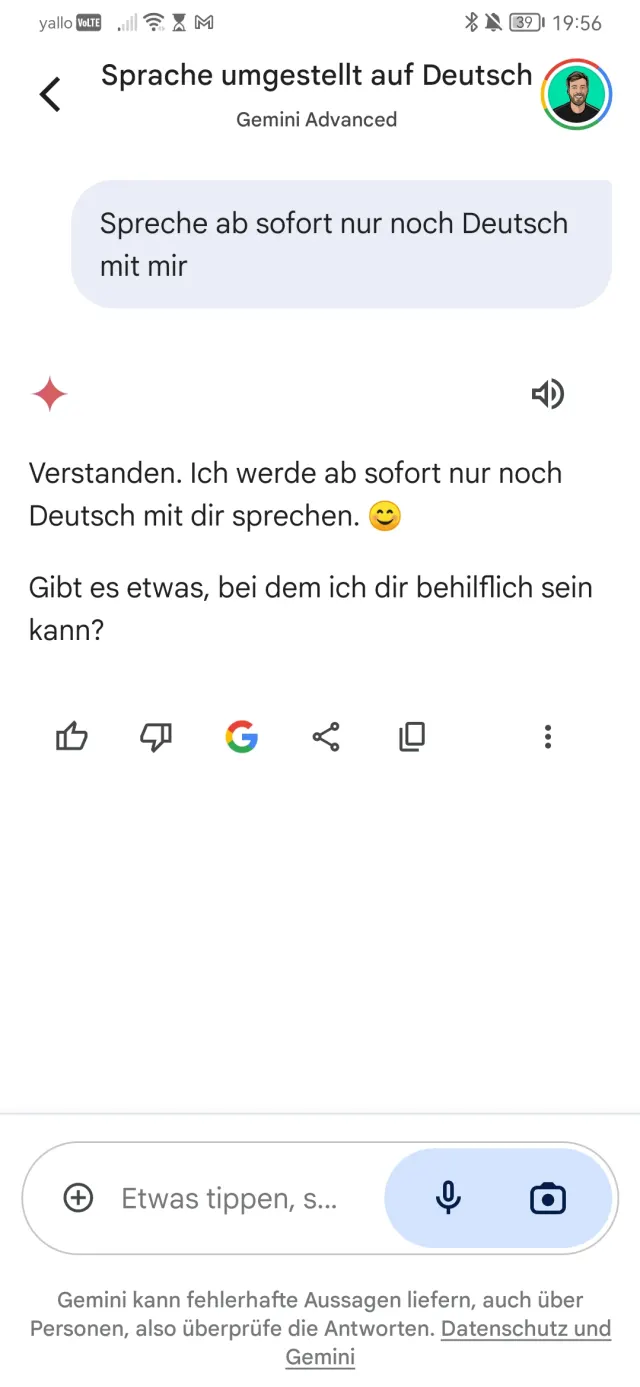 Sollte Gemini danach noch immer Englisch mit Ihnen sprechen, geben Sie einfach folgende Anweisung ein (per Text oder Sprache): Spreche ab sofort nur noch Deutsch mit mir, Bild 9.