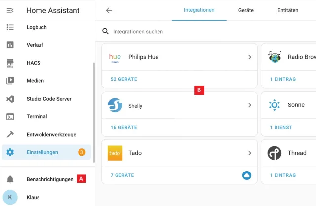 Die Einträge, die Sie in Bild 4 B sehen, nennen sich Integrationen. Das sind Erweiterungen, die den Kern von HA zu einem bestimmten Gerät oder zu einer Marke kompatibel machen. Später werden Sie weitere Integrationen hinzufügen, indem Sie in den Einstellungen unter dem Punkt Geräte & Dienste die Schaltfläche Integration hinzufügen anklicken, etwa dann, wenn HA ein neues Gerät nicht automatisch erkennt.
