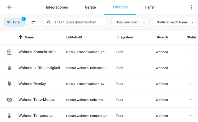 Jedes Gerät versorgt HA mit Entitäten – und zwar mit so vielen, wie es die Hardware zulässt. Eine Entität beschreibt den aktuellen Zustand des Geräts. Bei einem smarten Zwischenstecker gibt es vielleicht nur die Entitäten «Stecker ein» und «Stecker aus», während ein Bewegungsmelder noch weitere Entitäten liefert: für die Raumhelligkeit, die Temperatur oder wozu seine Hardware sonst noch in der Lage ist. Allein die Klimaanlage, die über die «AC Control V3+» von Tado° gesteuert wird, liefert 37 Entitäten, Bild 5.