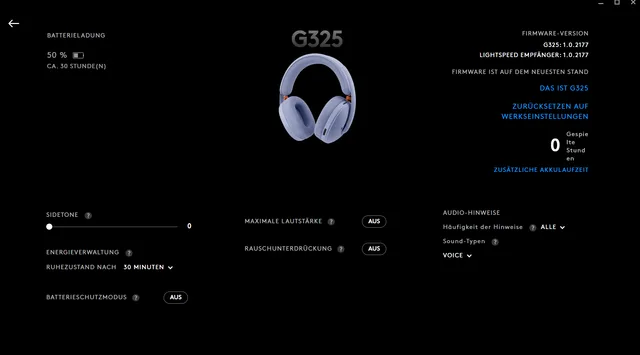 Wer mehr aus dem Headset herausholen möchte, installiert Logitechs G-Hub-Software. Sie zeigt nicht nur den aktuellen Akkustand an, sondern bietet auch einige Einstellungsmöglichkeiten. Dazu gehören etwa eine Begrenzung der maximalen Lautstärke, eine Rauschunterdrückung fürs Mikrofon oder die Einstellung der Stand-by-Dauer. Eine Sidetone-Funktion ist ebenfalls integriert – so hört man die eigene Stimme über das Headset.