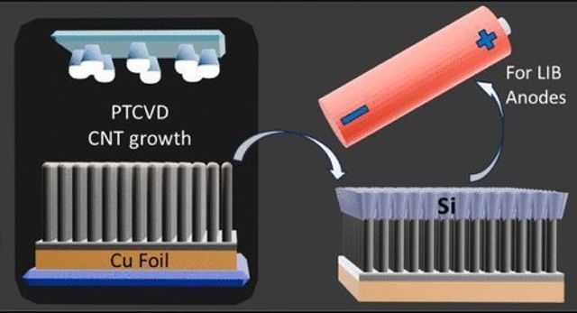 Um das zu verhindern, entwickelte das Forscherteam eine «Vertically Integrated Silicon–Carbon Nanotube» (VISiCNT) genannte Struktur. Bei diesem Design wachsen dichte Wälder aus Kohlenstoffnanoröhrchen auf einer Kupferfolie. Den oberen Abschluss bildet eine dünne Siliziumschicht, sodass ein flexibles, leitfähiges Gerüst entsteht, das die Ausdehnung auffangen kann, ohne Risse zuzulassen.