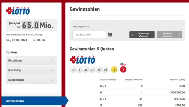 Spielende, bei denen die Seite am Mittwoch nicht lud, konnten aber aufatmen: Der Schweizer Lotto-Jackpot wurde wieder nicht geknackt. Neu liegt er bei 65 Millionen Franken. Die nächste Ziehung findet am kommenden Samstag statt.