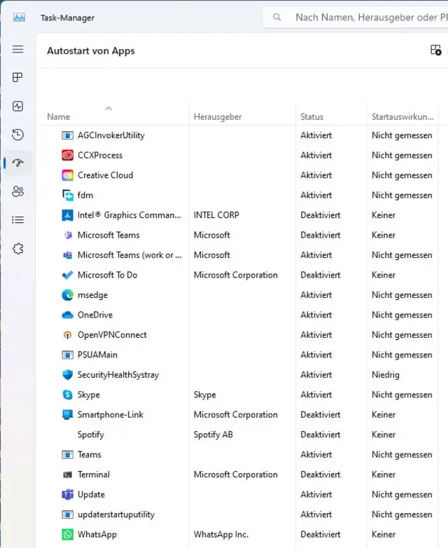 Autostart von Apps: Dieses Menü zeigt die Autostart-Programme an – also die Programme, die mit Windows aufstarten. Besonders wichtig ist die Spalte Startauswirkungen. Steht der Eintrag auf Hoch, ist in hohem Masse auch die Boot-Zeit betroffen.