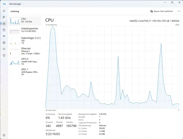 Leistung: Hier sehen Sie den aktuellen Ressourcenverbrauch des Prozessors, des Arbeitsspeichers, der Datenträger, des Netzwerks und der Grafikkarte (GPU). Diese Registerkarte verrät Ihnen Hardware-Engpässe, falls einer der Komponenten am Limit arbeitet.