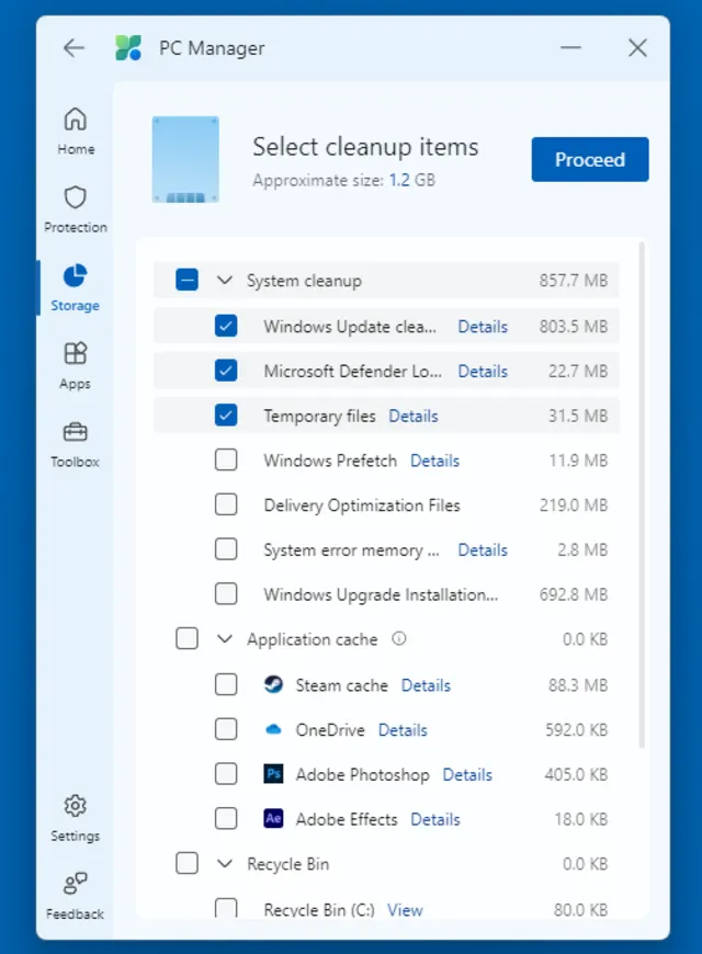 Unter dem Punkt Deep cleanup listet das Programm unter anderem Dateien auf, die nicht mehr benötigt werden und Ressourcen belegen, Bild 7. Das sind diverse Log-Files, temporäre Dateien sowie weitere nicht mehr benötigte Files. Klicken Sie auf Proceed werden diese gelöscht.