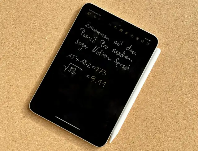 Pencil Pro. Ein Gewinn ist hingegen die neue Unterstützung des Pencil Pro, dem neusten Stift im Apple-Sortiment. Er erkennt die Rotation, reagiert auf Druck am Gehäuse und bietet ein haptisches Feedback, was ihn besonders für Zeichenanwendungen interessant macht. Aber auch für Notizen oder Anmerkungen in PDFs wird er zur praktischen Erweiterung – erst recht, weil durch die Verwendung von Apple Intelligence auch «handschriftlich gerechnet» werden kann, im Bild unten in gelber Schrift.