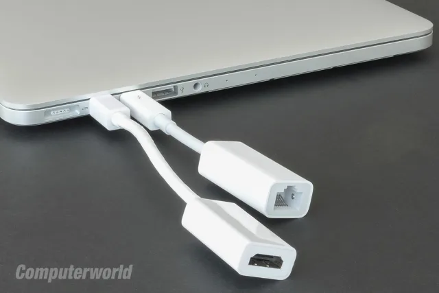 Den Thunderbolt-Anschlüssen kommt eine besondere Bedeutung zu. Apple bietet zahlreiche Adapter an, die fr je 32 Franken verkauft werden. Sie verbinden das MacBook Pro mit Gigabit-Ethernet-, FireWire-, VGA- und DVI-Kabeln. Die Thunderbolt-Buchsen sind ausserdem DisplayPort-kompatibel, so dass sich jeder geeignete Monitor anschliessen lässt.