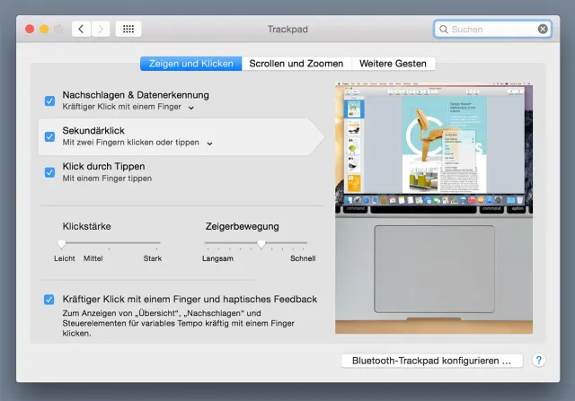 Insgesamt stehen drei Klick-Varianten zur Auswahl: das einfach Antippen ohne Klickgeräusch, den «leichten Klick» und den «kräftigen Klick». Was die Klicks im Detail auslösen, kann in den Systemeinstellungen definiert werden ? genauso wie der Druck, der dazu erforderlich ist: