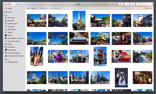 Die iLife-Suite besteht aus den Programmen iPhoto (Foto-Optimierung und -Verwaltung), iMovie (Videoschnitt) und GarageBand (Musik). iPhoto. iPhoto bietet keine Retusche-Möglichkeiten wie etwa Photoshop Elements; stattdessen werden Bilder optimiert, sortiert, geteilt und zu Büchern und Abzügen verarbeitet. iPhoto ist ausserdem der beste Weg, um Fotos mit einem iOS-Gerät zu synchronisieren. Allerdings sind seine Tage gezählt: In wenigen Wochen wird iPhoto von der neuen Anwendung Fotos abgelöst. Trotzdem lässt sich iPhoto immer noch bedenkenlos nutzen, da sich die Sammlung praktisch verlustfrei in Fotos überführen lässt.