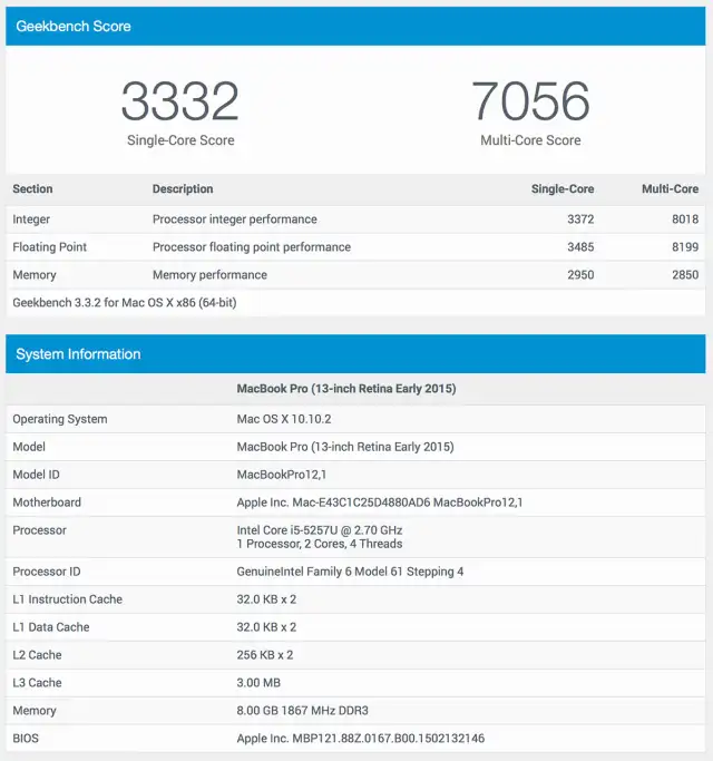 Prozessor. Im Inneren des MacBook schlägt ein Intel Dual-Core Core i5 mit der neuen, überfälligen Broadwell-Architektur. Der Takt liegt bei 2.7 GHz und wird bei Bedarf automatisch auf 3.1 GHz erhöht. In unserem Test ermittelte Geekbencheinen Wert von 7056. Der Prozessor kann im Online-Store für 330 Franken durch einen i7 ersetzt werden (3.1/3.4 GHz). Das sind solide, aber unspektakuläre Werte.