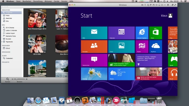 Wenn es sein muss, versteht sich das MacBook Pro auch mit Windows. Dazu stehen zwei Lösungsansätze zur Auswahl. Virtualisierung. Am einfachsten verwendet man einen Virtualisierer wie Parallels Desktop oder VMware Fusion. Dabei wird die Windows-Umgebung in einem eigenen Fenster innerhalb der Mac-Umgebung betrieben. Die beiden Systeme teilen sich also die Ressourcen, der Datenaustausch ist ein Kinderspiel. Im Idealfall wird die virtuelle Windows-Umgebung auf einem zweiten, angeschlossenen Monitor dargestellt.